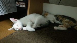 PCデスクの下は、二人とも大好きな場所なので、一緒に寝ています。