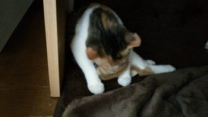 モナは足元に陣取り毛づくろい。