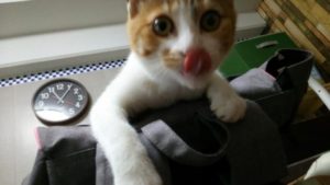 お仕事行く時に持って出ているリュックになぜかじゃれています。