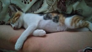 腕や足に寄り添う?洗濯物の上で寝る。しっぽを踏む