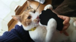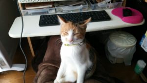 膝の上はお気に入りの場所なのか、大福も最中も良く乗っかっています。