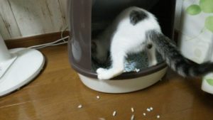 フードつきのトイレを買ったのに、フード付のトイレと同じくらい砂が飛び散っている…