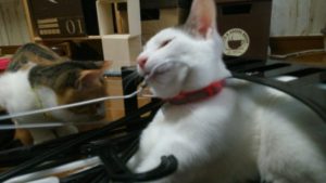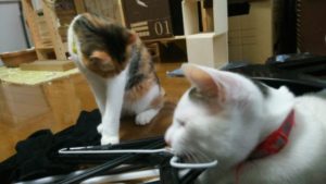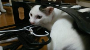 今日はハンガーを入れてある書類ケースで遊んでいるようです。