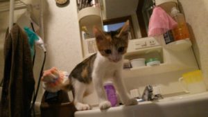 今日も洗面台に登って何やら物色している最中…